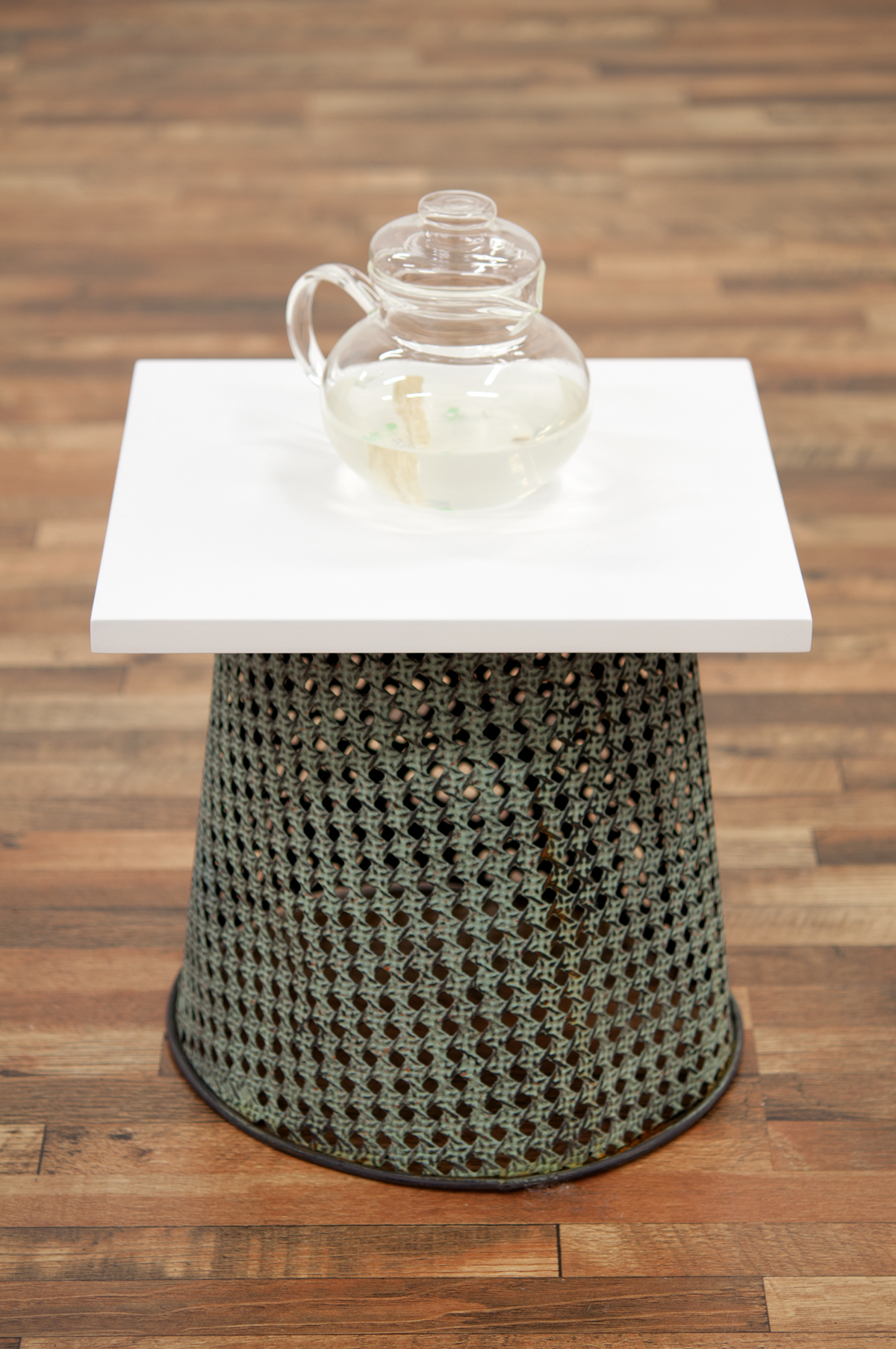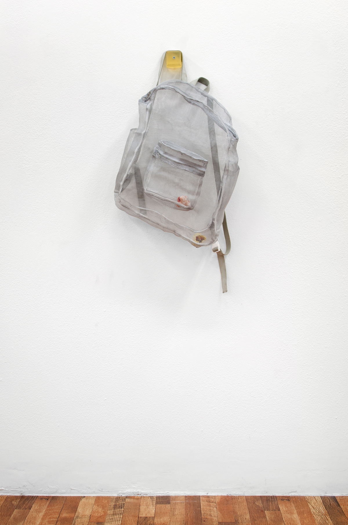 Carlos Reyes Untitled (cinnamon lung tether #1), 2014 3D powder print, aluminum mesh bag, glycerin, palm oil, coconut oil, trans-cinnamaldehyde, metal screw