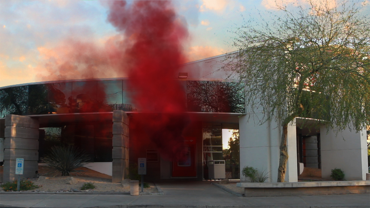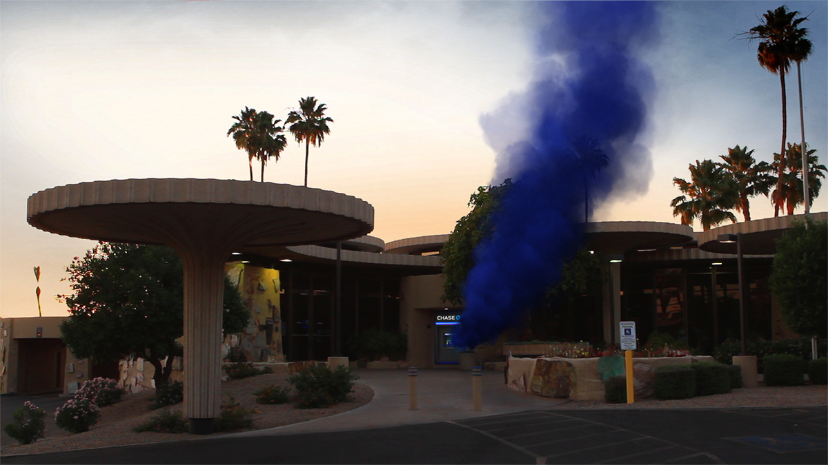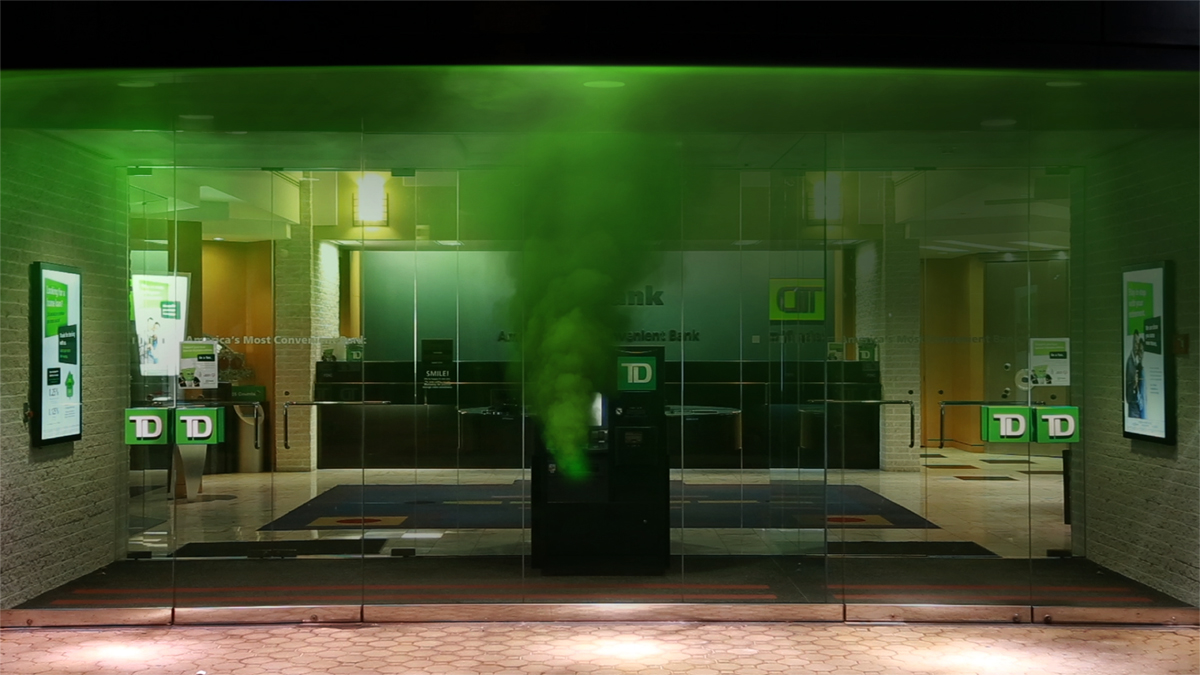 Andrew Norman Wilson Chase ATM emitting blue smoke, Bank of America ATM emitting red smoke, TD Bank ATM emitting green smoke, 2014 HD video, audio 5 minutes, 48 seconds