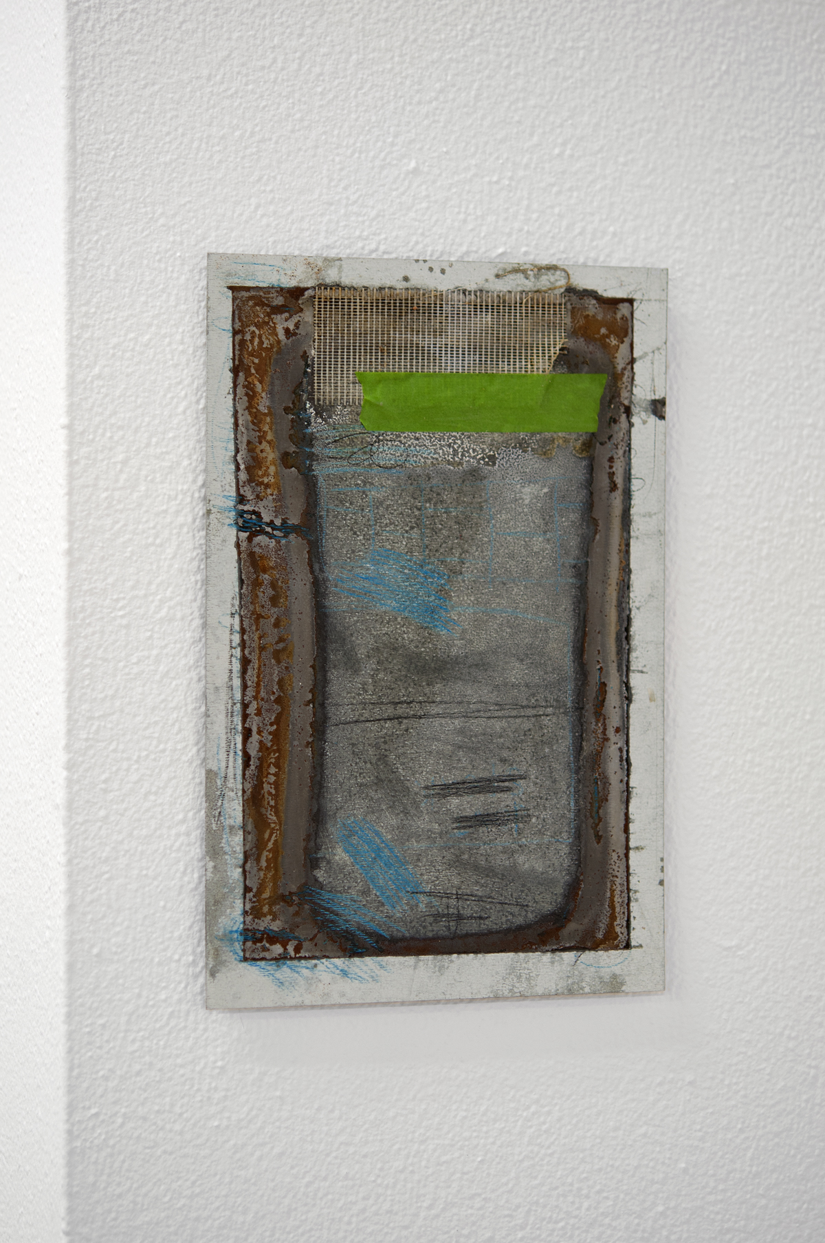 Santiago Leyba Anxious Plate, 2014 Etched steel shingle, oil pencil, tape