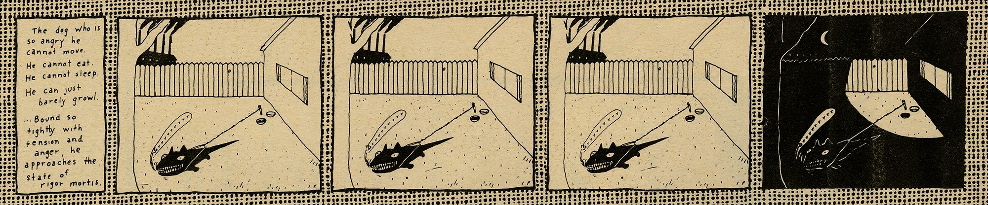 Seething is a sullen type of anger. In opposition to anger as a flame, as violence, yelling, broken plates or mirrors. Contagious, spectacular anger. The Dog, instead, is a smoldering log. Maybe it’s surprising that The Angriest Dog in the World has no bark and no bite. But seething is concerned less with fanning out into the world than with keeping a lid on it. (Or keeping a screen in front of it.) I used to think of anger as an event, a rupture, an thus a moment of opportunity. But now I know anger as the baseline between outbursts. Seething is not a switch but a sieve. It is the pain, quotidian. It is an imperceptible atrophy. This can be consuming.