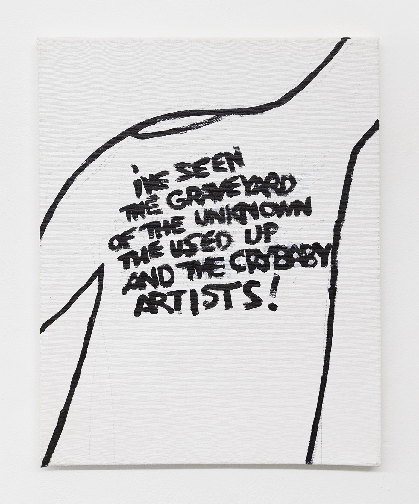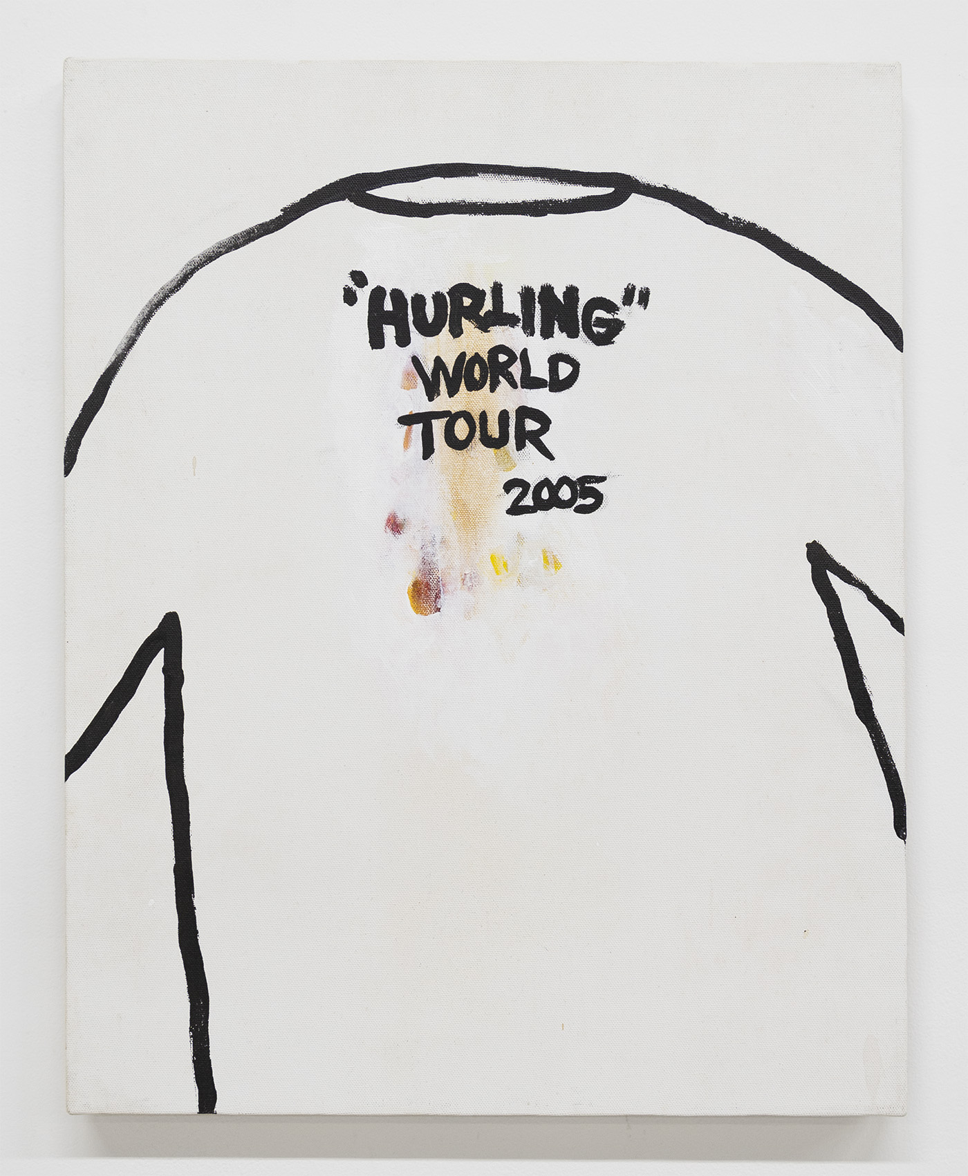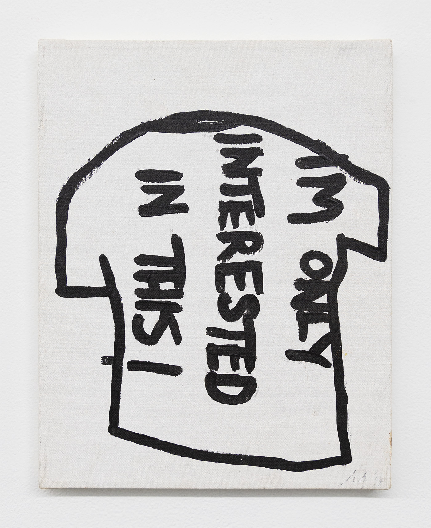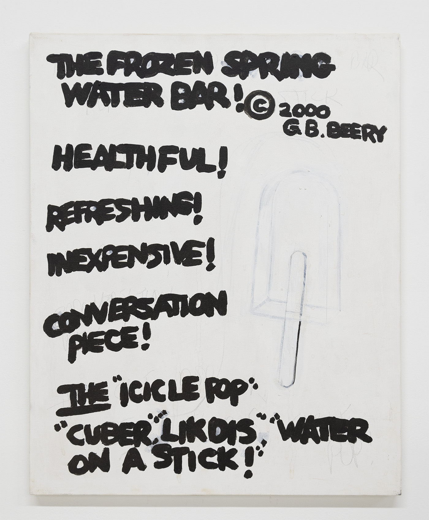 Beery’s earliest works on canvas are post-modern reflections on the nature of art, the role of the artist, and the razor’s edge between success and failure. Mid-career efforts feature inside jokes, outside koans, and obliquely aspirational proclamations as if drafted by a gifted, wayward sign painter. Later works, many of which include pithy and poetic slogans atop crudely rendered t-shirts, cut to the quick of what it means for an artist to make their mark, if only for one extraordinary and pathetic sweep across the canvas.