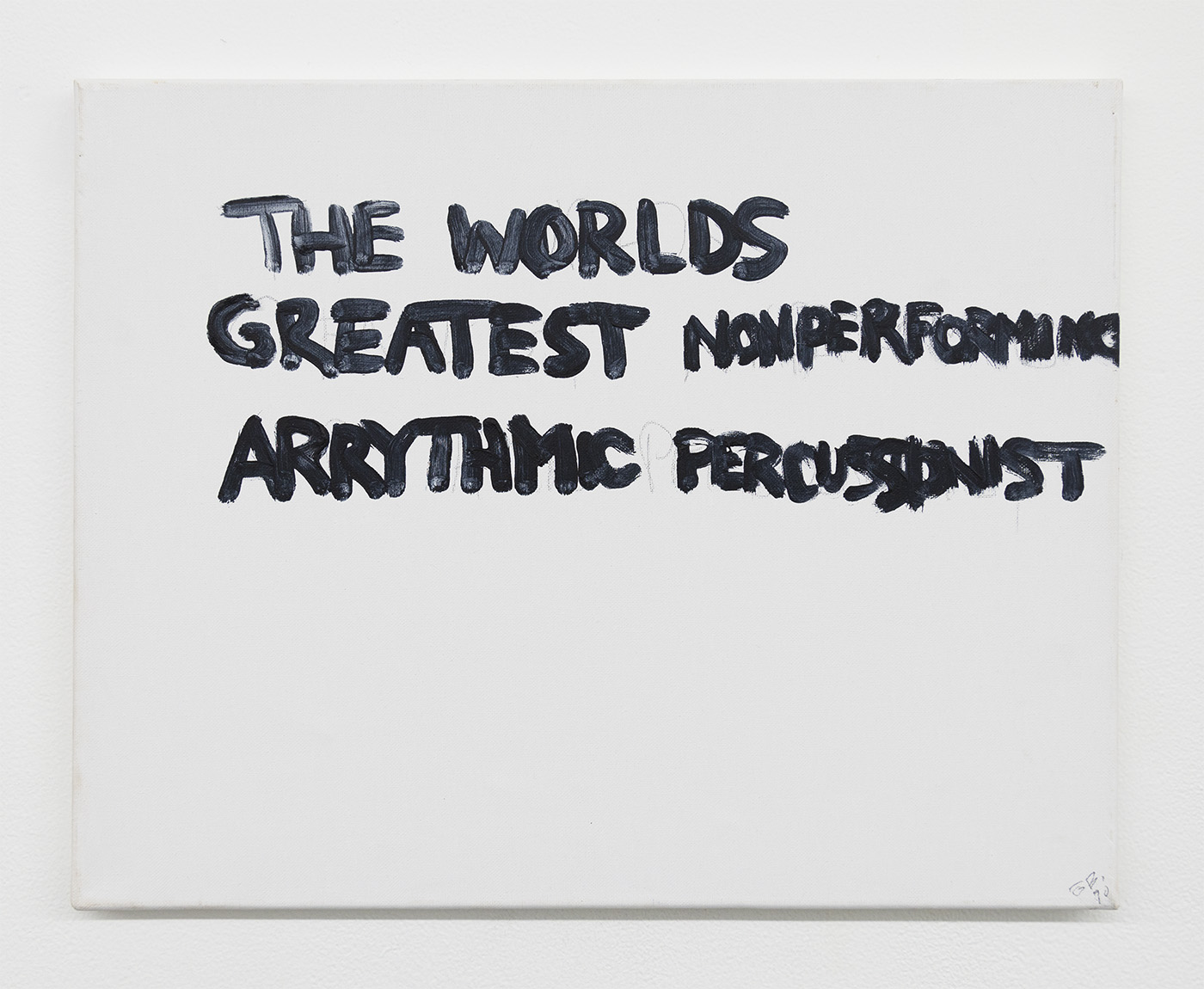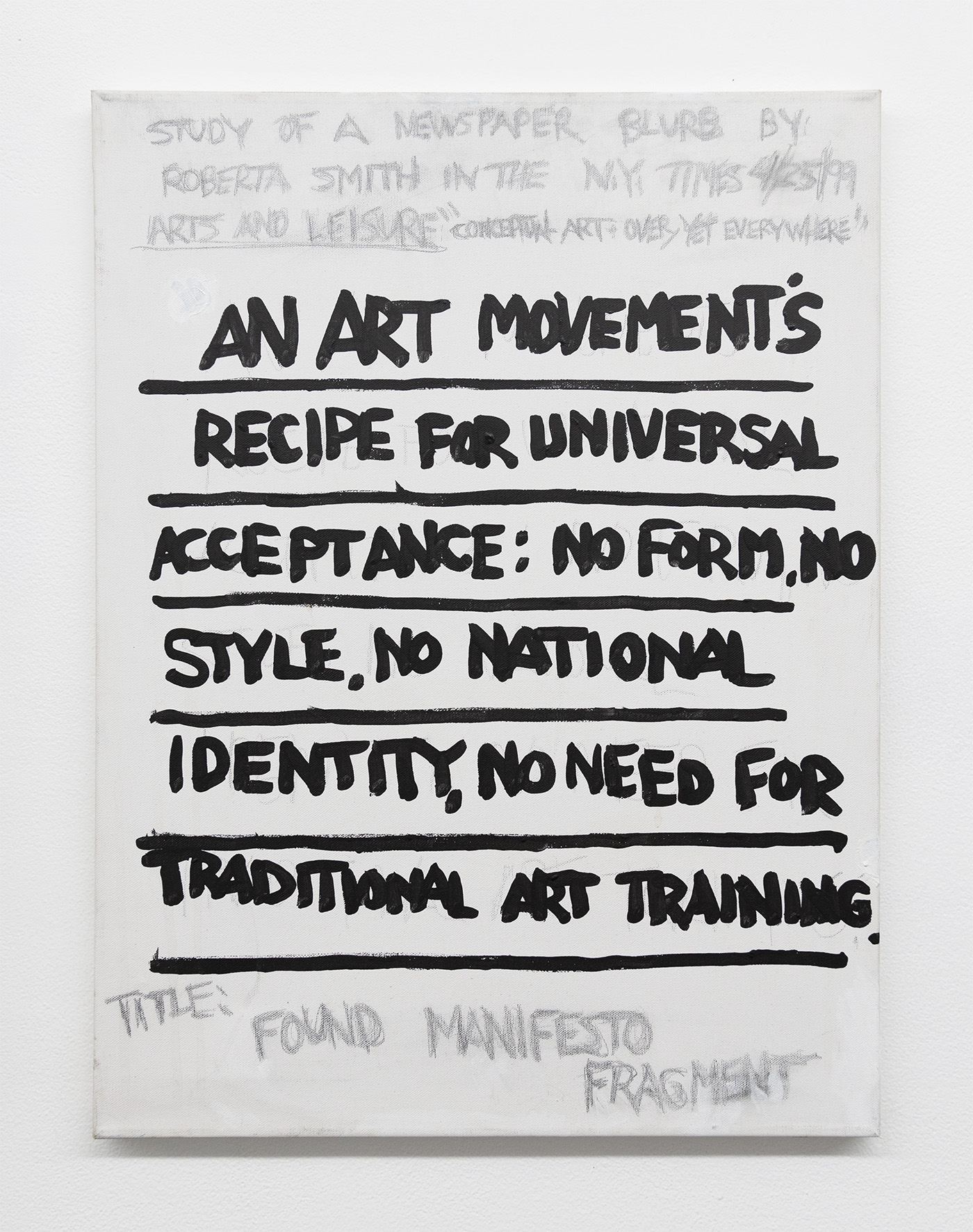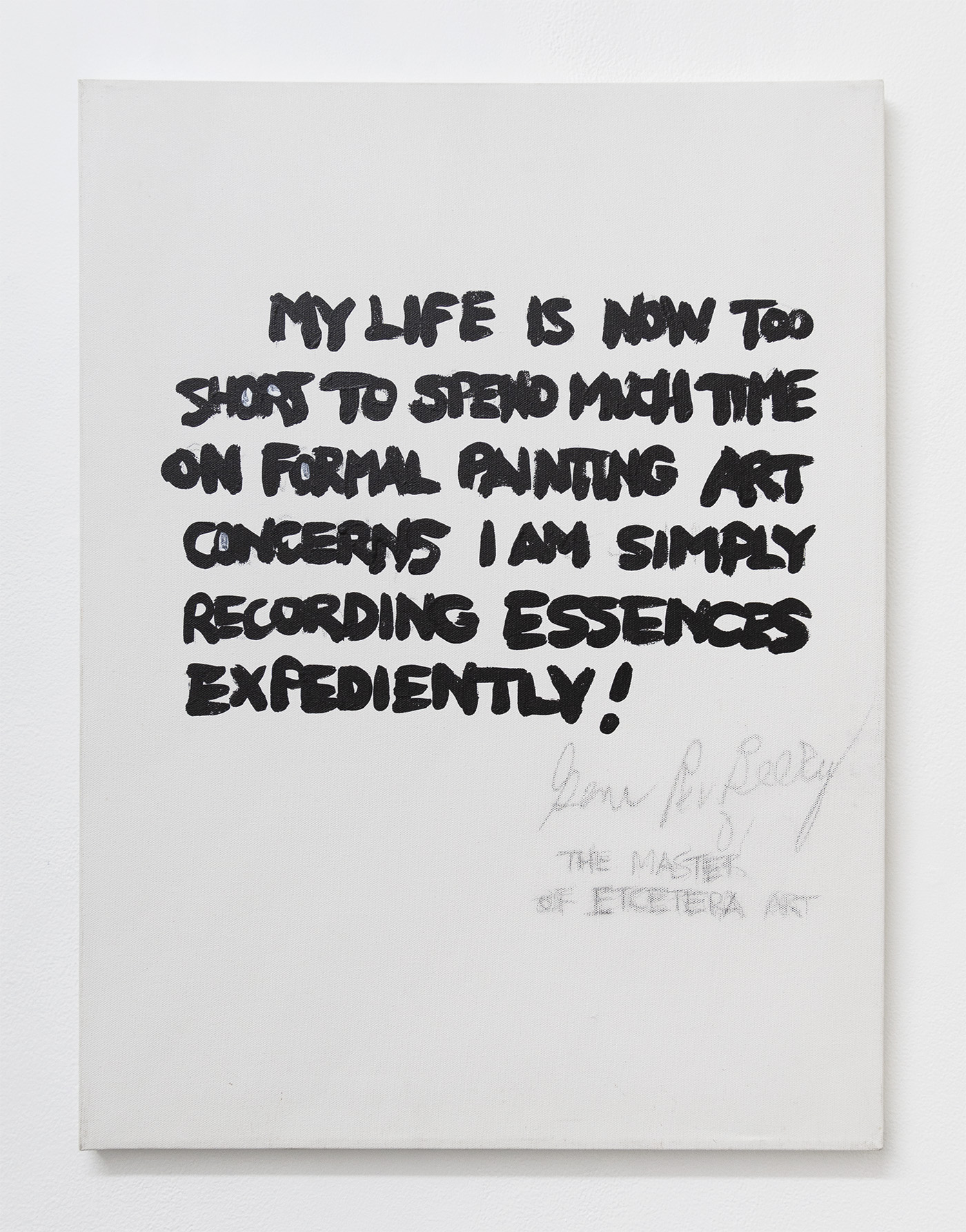 Beery’s earliest works on canvas are post-modern reflections on the nature of art, the role of the artist, and the razor’s edge between success and failure. Mid-career efforts feature inside jokes, outside koans, and obliquely aspirational proclamations as if drafted by a gifted, wayward sign painter. Later works, many of which include pithy and poetic slogans atop crudely rendered t-shirts, cut to the quick of what it means for an artist to make their mark, if only for one extraordinary and pathetic sweep across the canvas.