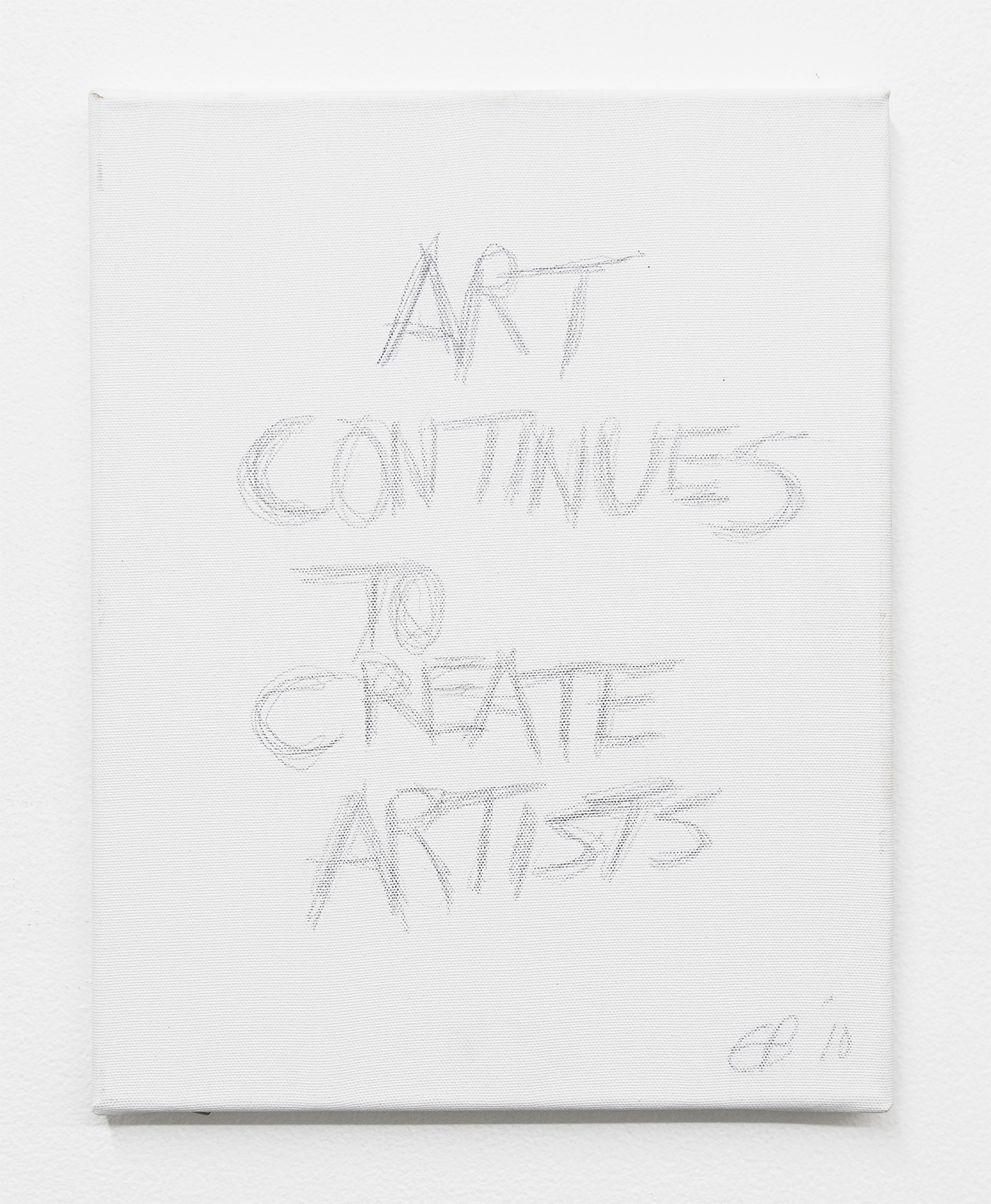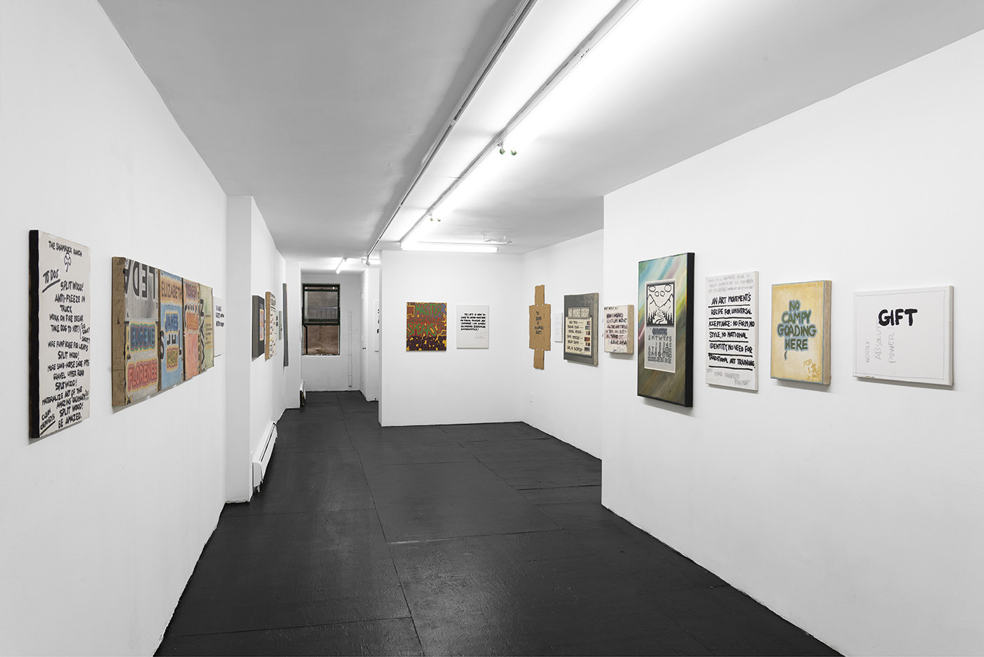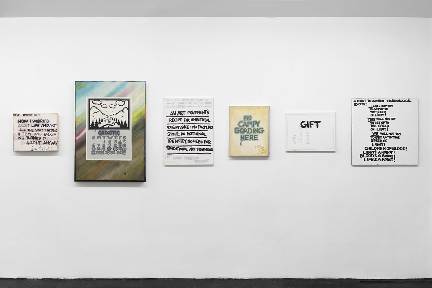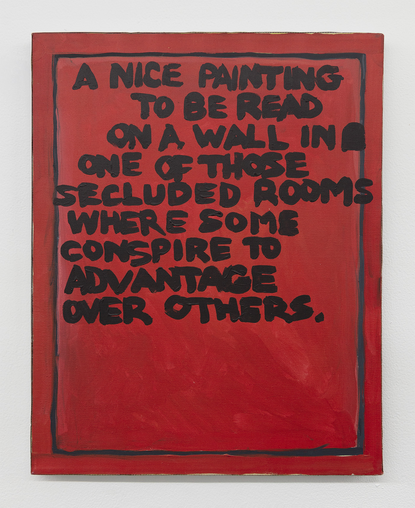 Beery’s earliest works on canvas are post-modern reflections on the nature of art, the role of the artist, and the razor’s edge between success and failure. Mid-career efforts feature inside jokes, outside koans, and obliquely aspirational proclamations as if drafted by a gifted, wayward sign painter. Later works, many of which include pithy and poetic slogans atop crudely rendered t-shirts, cut to the quick of what it means for an artist to make their mark, if only for one extraordinary and pathetic sweep across the canvas.