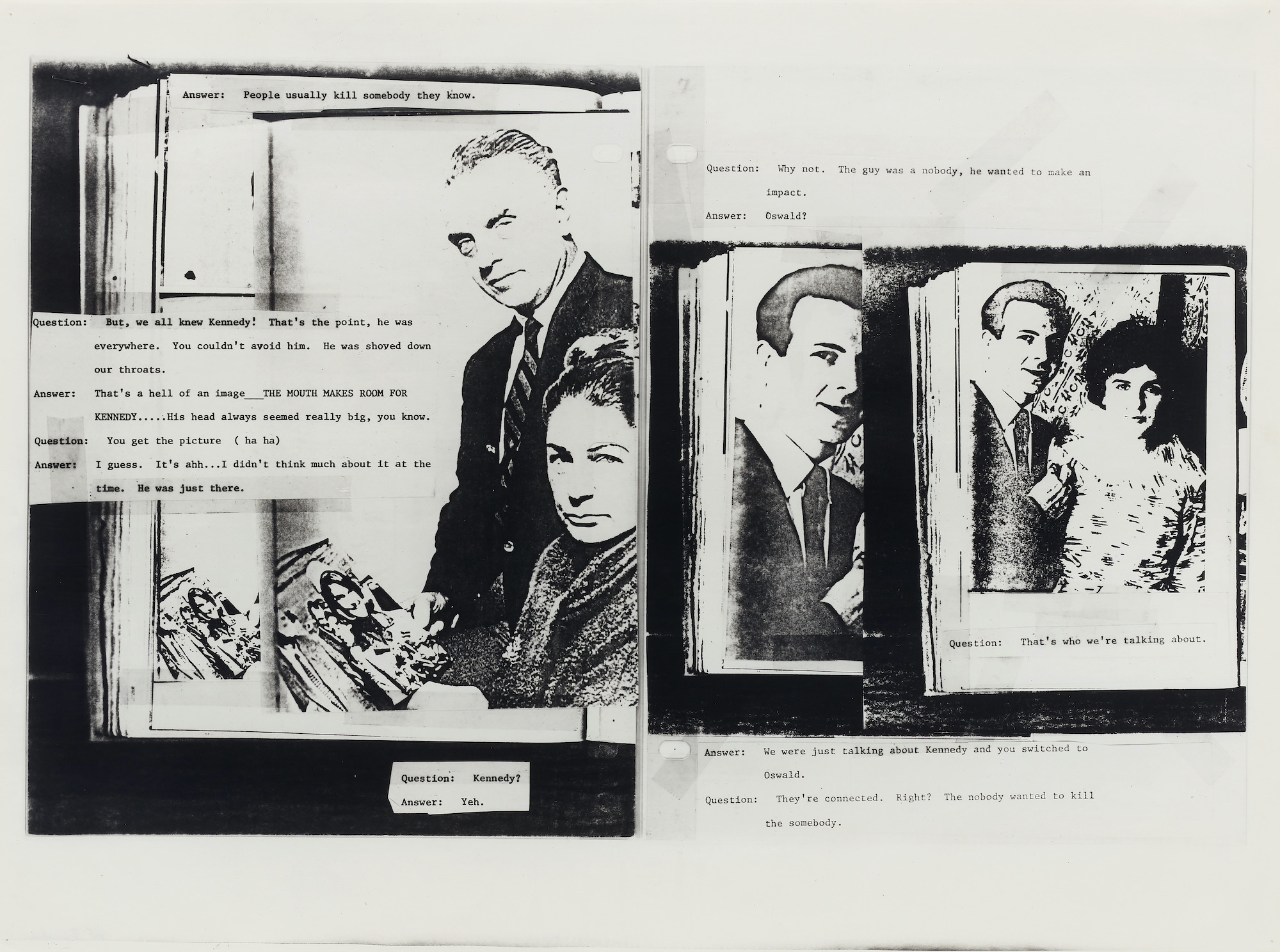 The resulting work, “The Lee Harvey Oswald Interview,” is an 18-page photocollaged interview, initially made as paste-ups, mixing snippets of questions and answers written by Lutz with myriad photocopies of Oswald’s face. From these, Lutz derived photostatic prints – a technique favored in legal contexts at the time for its direct relation to original documents, a reproduction with the truth-claim of its referent. A direct photostat appears as a “negative,” white on black, from which a “positive” can then be derived. Lutz produced both, and considered them new, unique iterations of the work, either equal to or even superseding the paste-ups in their primacy. The choice of Oswald as the work’s ostensible subject, however, pits photostatic truth against one of the great examples of uncertainty in images: debates persist as to whether this or that picture of Oswald has been doctored, with independent researchers spending years analyzing the grainy shadows of Oswald’s face – in search of what, exactly?
