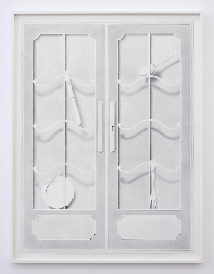 Milano Chow’s highly detailed drawings depict impossible arrangements of ornate objects. Dinnerware (2014–2015) is typical of the trompe l'œil graphite-on-paper work the Los Angeles-based artist has produced over the past few years. Floating behind the elaborate façade of a curio cabinet are a spoon, a butter knife, a plate and a fork. The shadows cast by these items suggest the shallowness of the cabinet's interior, but there is no discernible background. Instead, the pieces of crockery and silverware hover vertiginously before a pale monochrome void.