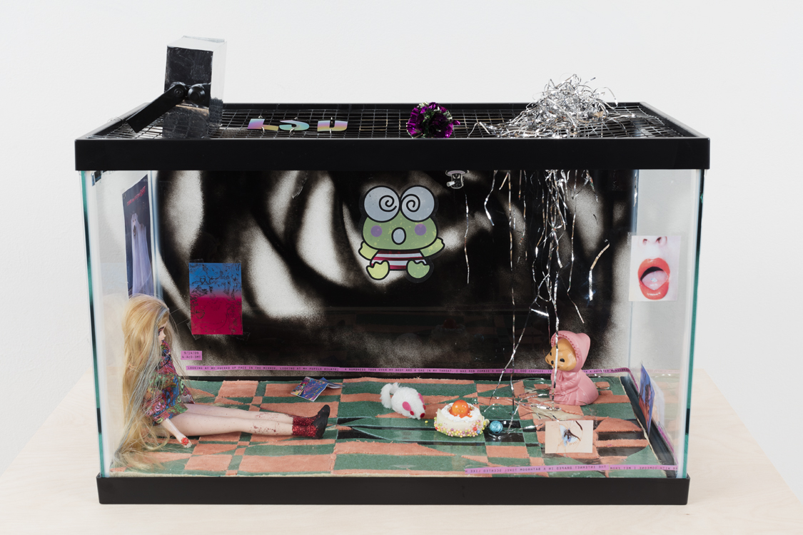 In “Fufu’s Dreamhouse,” her first New York solo exhibition, Maggie Lee (b. 1987) continued to elaborate her diaristic exploration of adolescent girlhood, Millenial subcultures, and style. Rooted in blogging, honed in zines, and realized in Mommy, her acclaimed 2015 about the death of her mother and their life together, Lee’s approach here turned to sculpture, the artist presenting a series of dioramas set on wooden tables. Staged mostly within glass terraria and performed through Jenny dolls—a Japanese Barbie corollary brand established in the 1980s—the scenes depicted are from an adolescence based roughly on Lee’s own. With custom outfits and hair styled by Lee, the Jennys appear alone in their chambers, sedately preoccupied: one plays with a synthesizer on her bed; another models a thrift-store outfit; another waits out a bad acid trip. While one is dancing, most simply sit, rigid, among the posters, stickers, and other items that Lee has concatenated around them. They seem spaced-out, bored and waiting.