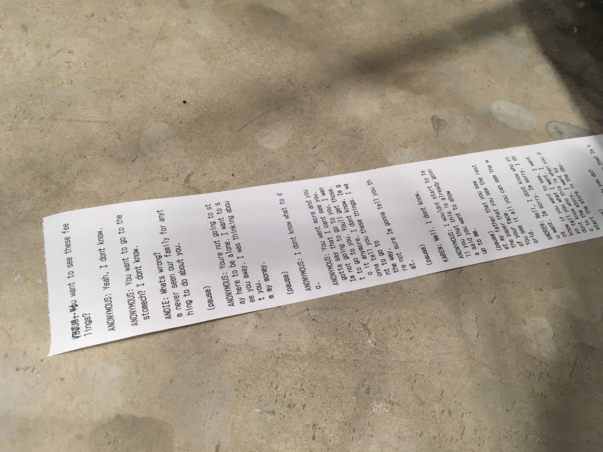 Here, at what would traditionally be the final curtain, the robot starts to spit out a long receipt, which is itself play dialogue. It is both old and new: a computer-generated script synthesized, live, from an archive of Maxwell’s complete plays to date. It gives an imperfect, not-quite-human averaging of the language and affect that makes up Maxwell’s corpus. It’s telling. One sample, from January 12’s receipt, reads: