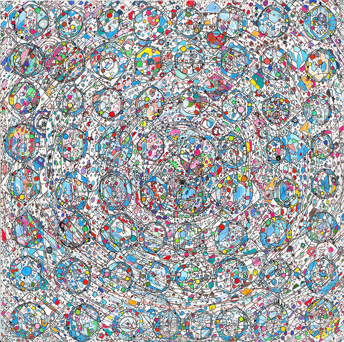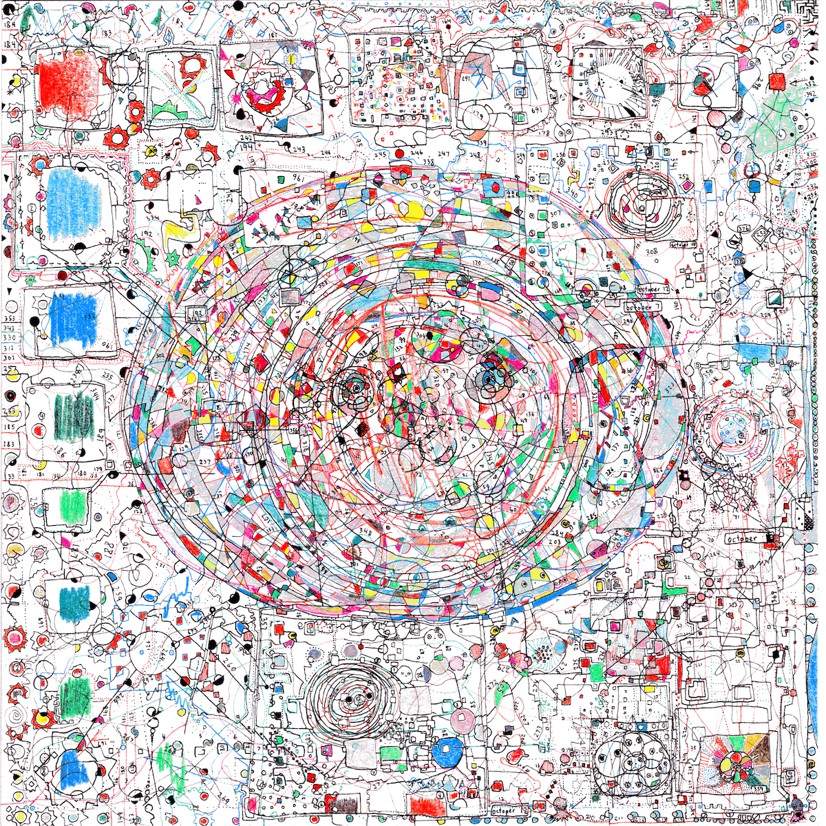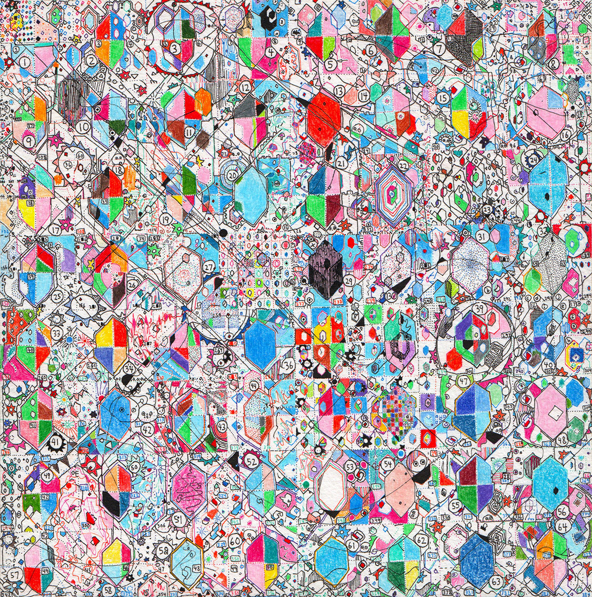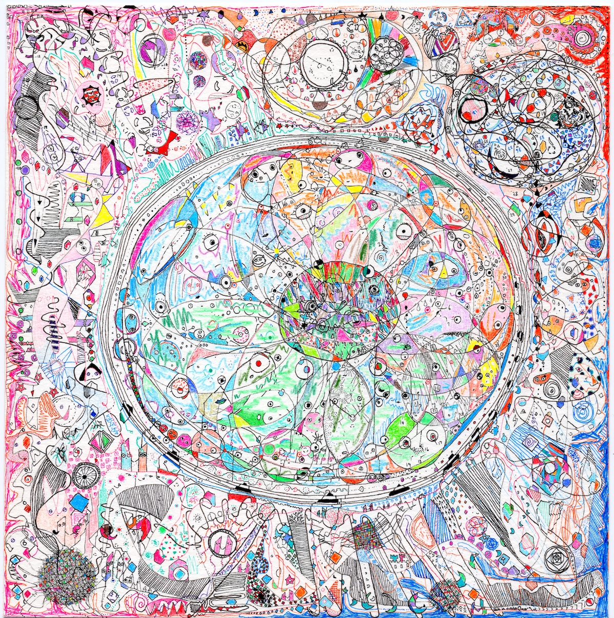 Tao Lin has drawn mandalas since February 2014. To date, each mandala has been an 8-inch square of paper populated by many hours’ work of meditative line and color. They are ambivalent toward upright orientation: Lin rotates the mandalas as he draws them, preferring radial patterning over compositional hierarchy. Their dense, fractal buildups reward contemplation that oscillates between levels of detail, as Lin has described it, “like veins in leaves.”1