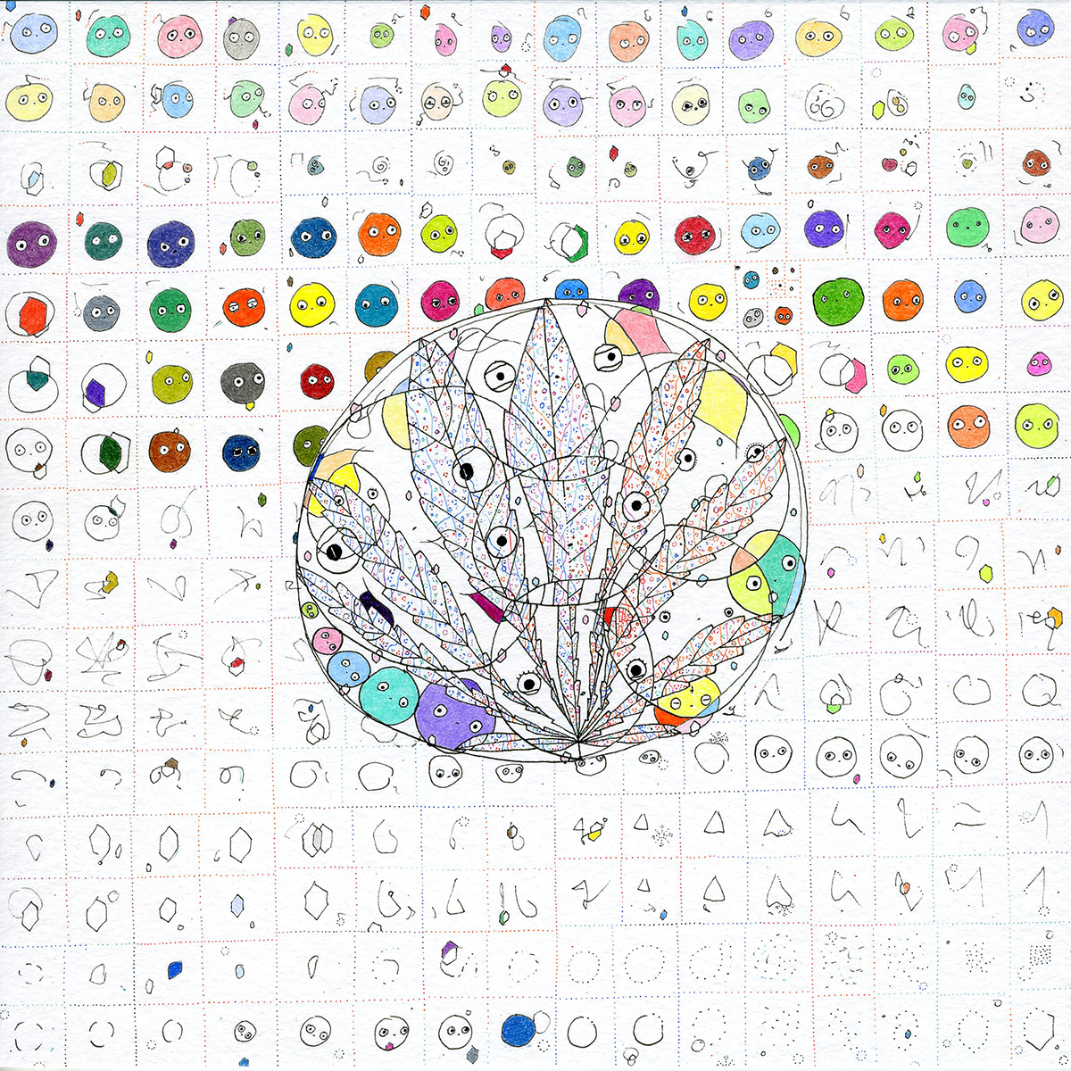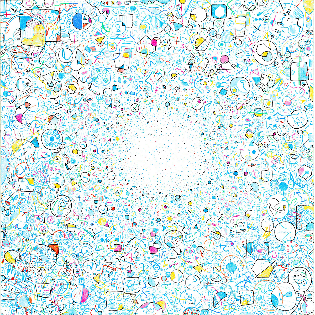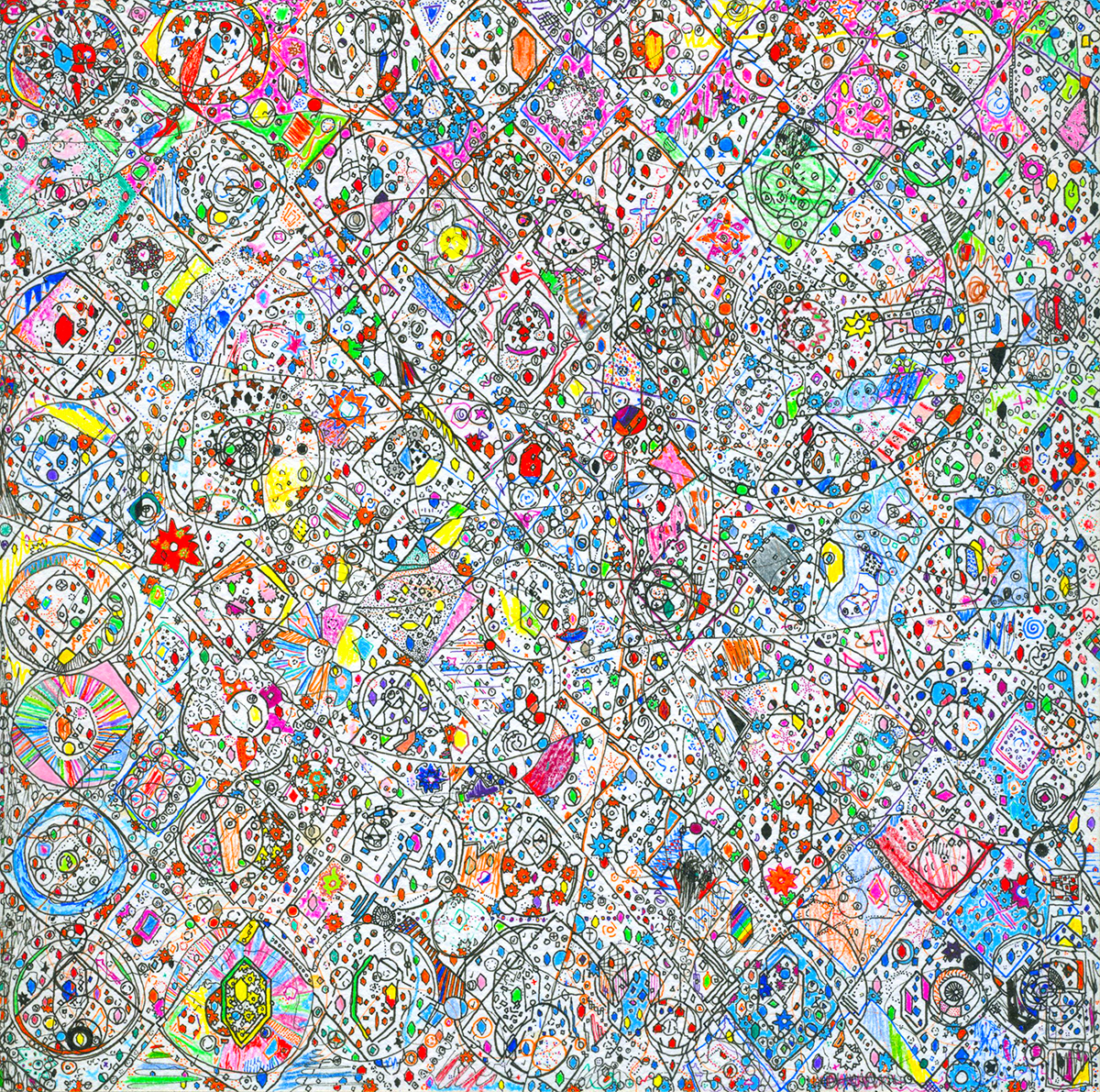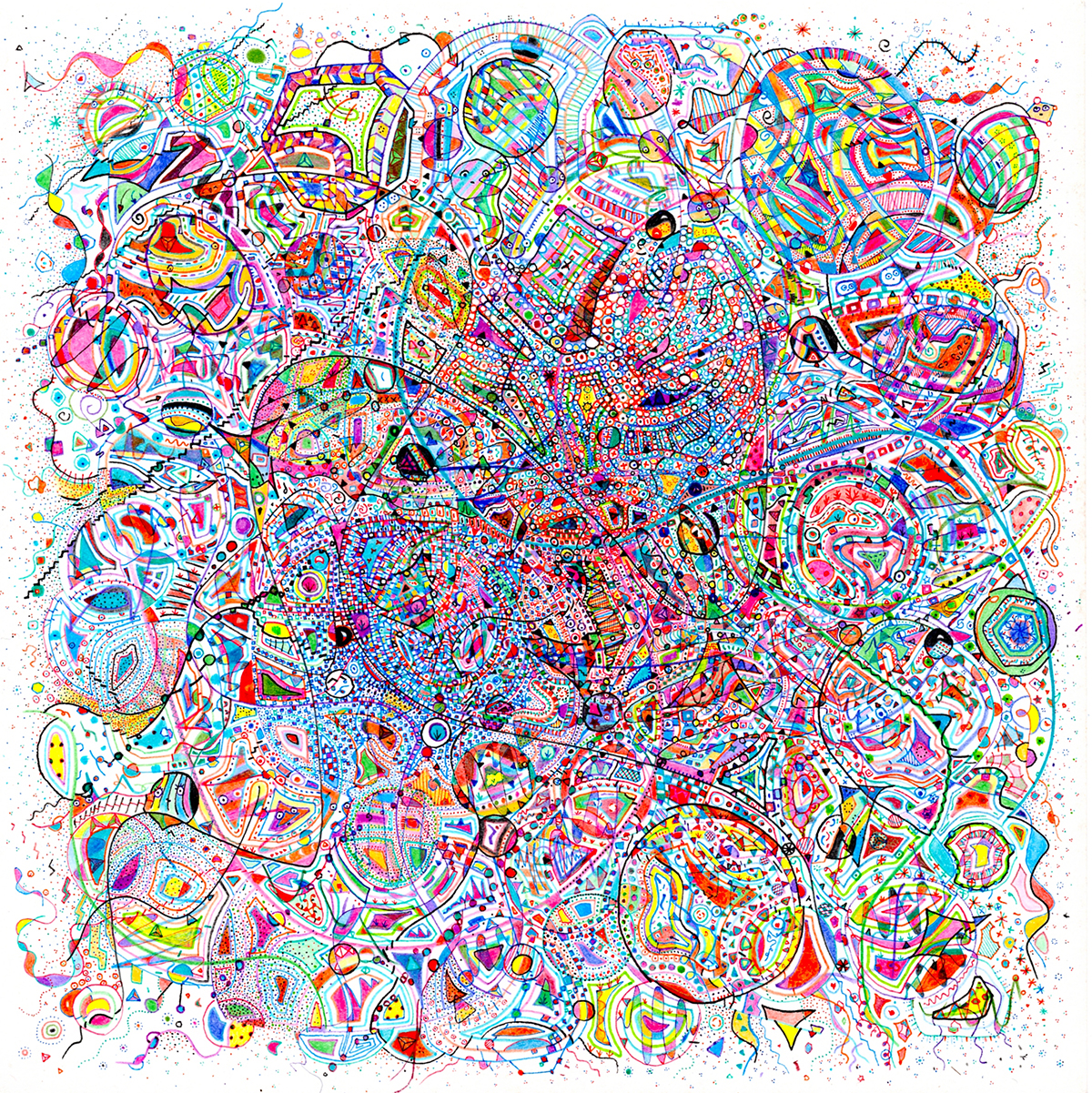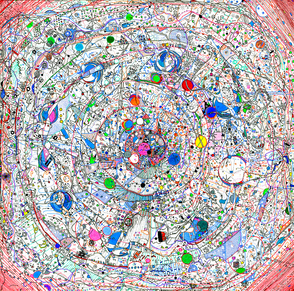 Tao Lin has drawn mandalas since February 2014. To date, each mandala has been an 8-inch square of paper populated by many hours’ work of meditative line and color. They are ambivalent toward upright orientation: Lin rotates the mandalas as he draws them, preferring radial patterning over compositional hierarchy. Their dense, fractal buildups reward contemplation that oscillates between levels of detail, as Lin has described it, “like veins in leaves.”1