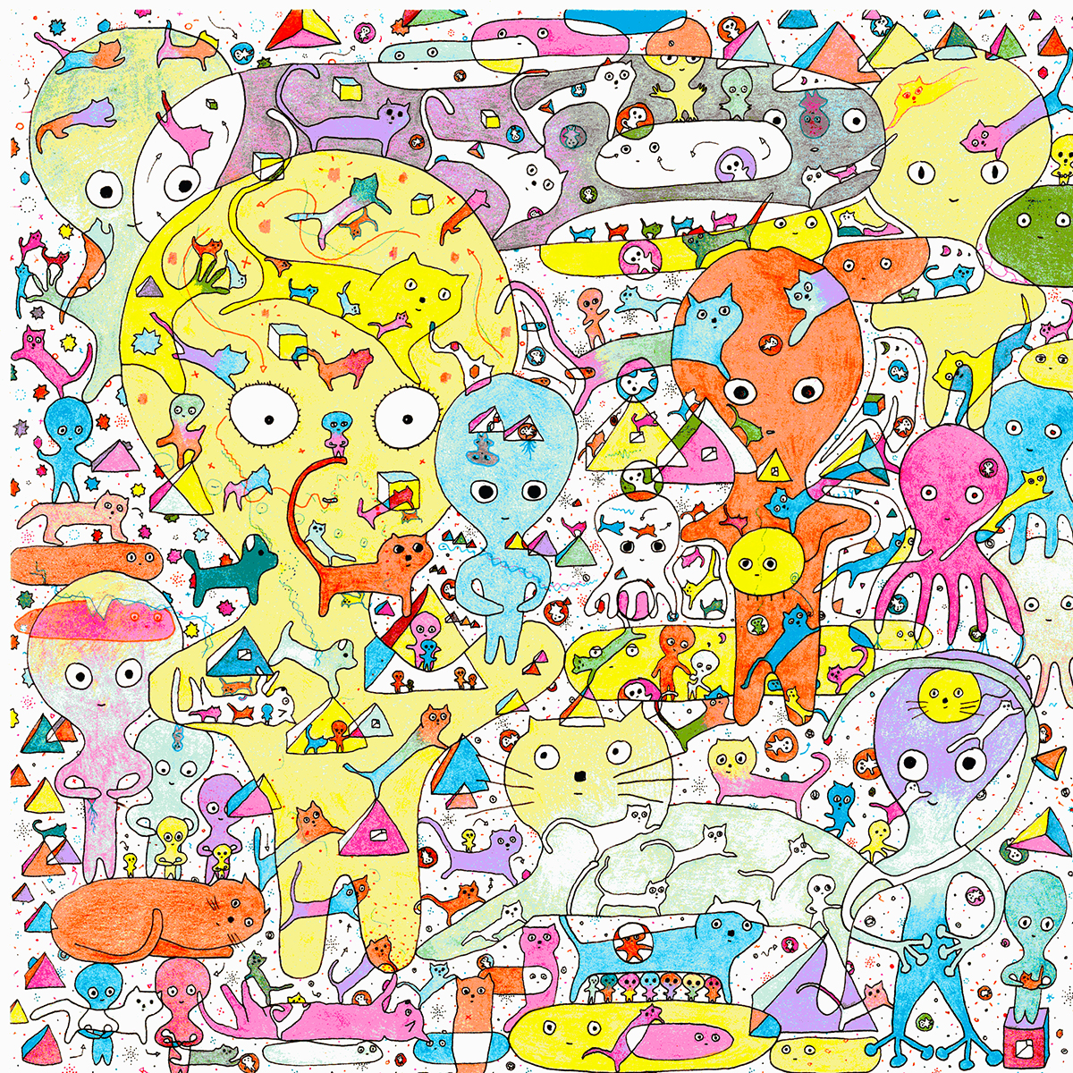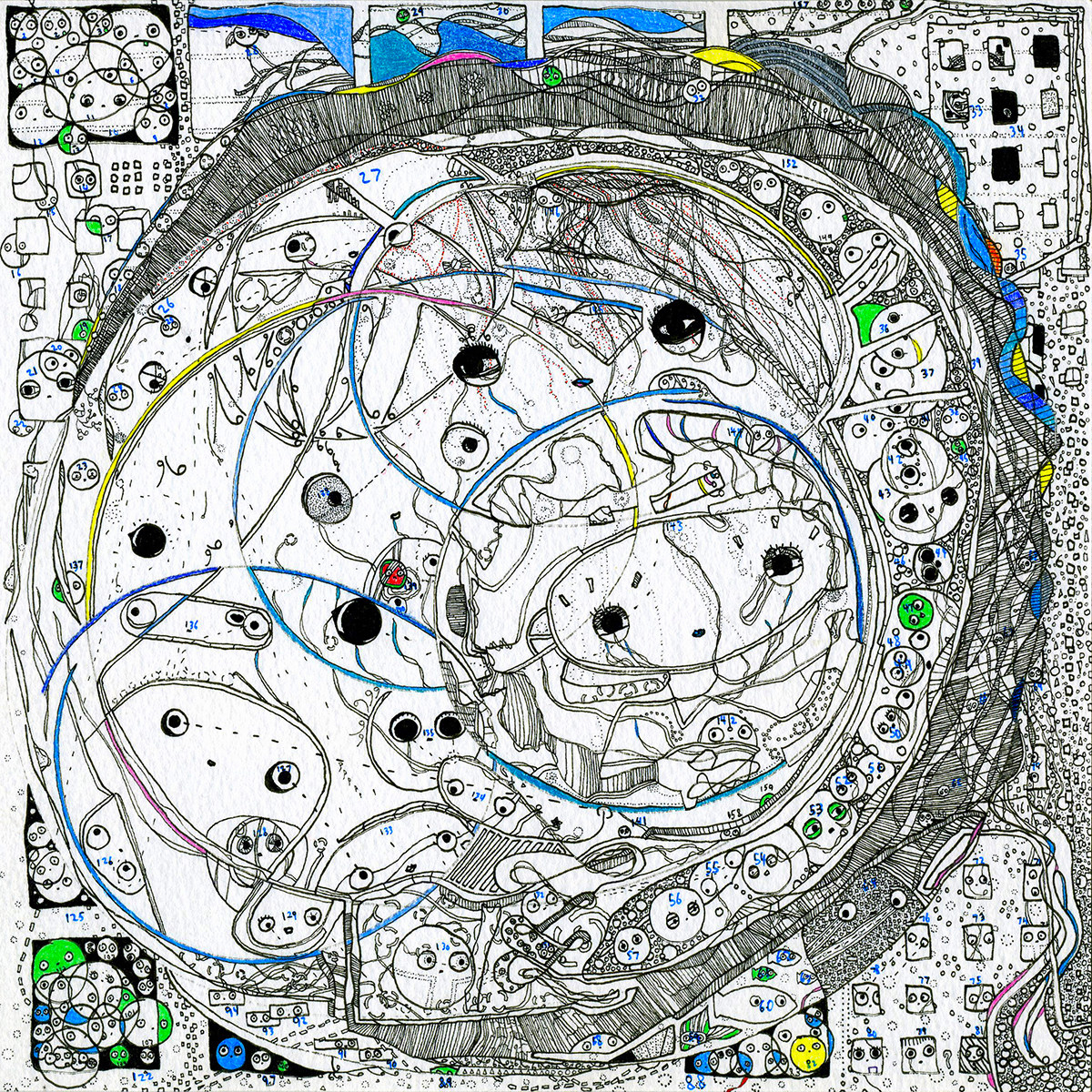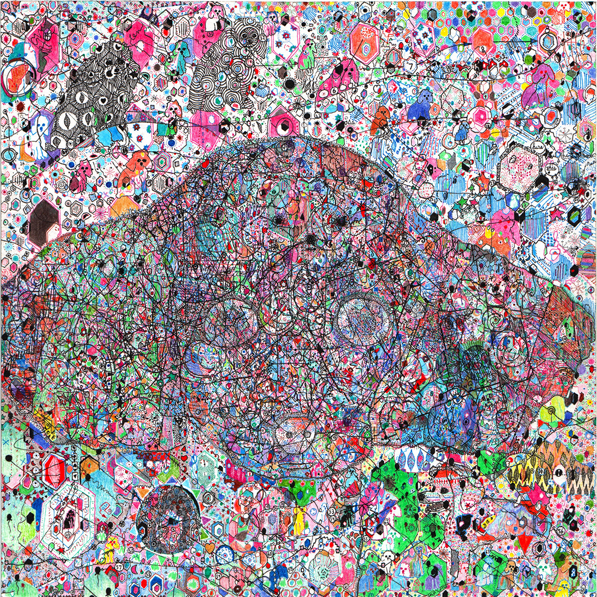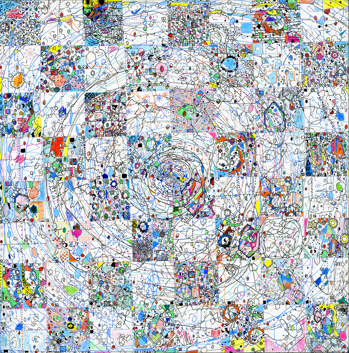 Tao Lin has drawn mandalas since February 2014. To date, each mandala has been an 8-inch square of paper populated by many hours’ work of meditative line and color. They are ambivalent toward upright orientation: Lin rotates the mandalas as he draws them, preferring radial patterning over compositional hierarchy. Their dense, fractal buildups reward contemplation that oscillates between levels of detail, as Lin has described it, “like veins in leaves.”1