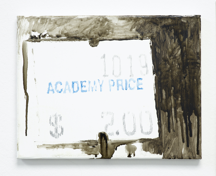 Whitney is interested in figures like Cobain as the subcultural phenomena they originally were *and* as the upcycled, memefied icons-without-borders that they have become in our outsideless era. Take her painting of the Dickies logo: a grubby carbon transfer of a legacy workwear brand associated with ’90’s slackers, yet it’s polished with so much enamel that it takes on a strange, glossy regality, not unlike the brand’s actual collabs with Opening Ceremony and Supreme, or Whitney’s repurposing of an empty Kahlua shooter as a boutique fragrance bottle, or Peep’s amplification of, say, a Modest Mouse track from 1996. Yet all this repurposing is not without cost. Upcycling is the cousin of upzoning, and always looming in Whitney’s art is the specter of precarity, with the ever-tightening noose of American cities’ cost of living. One painting in the show depicts a price tag from Academy Records, which used to have a great dollar bin; the painting shows that, as of October 2019, the “Academy Price” can only be two dollars.